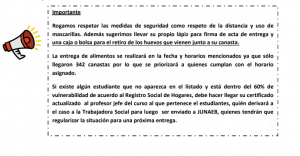 La entrega de canastas de alimentación de JUNAEB se realizará el día lunes 25 de mayo en el horario que se detalla a continuación: