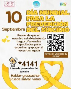 Hoy conmemoramos el Día Mundial para la Prevención del Suicidio, una fecha que nos invita a reflexionar sobre la importancia de la salud mental y el acompañamiento oportuno. Recordemos que hablar, escuchar y apoyar puede salvar vidas. Como comunidad educativa, reafirmamos nuestro compromiso de promover espacios de cuidado, respeto y contención emocional para nuestros estudiantes, familias y funcionarios. ¡Prevenir está en nuestras manos!